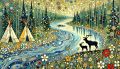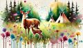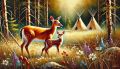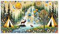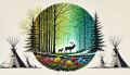 Enchanting Wilderness Scene: Deer and Tipis Amidst a Forest Clearing