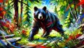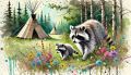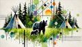 Vibrant Encounter: Bear and Cub Amidst Forest Teepees at Dawn