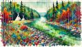 Enchanting Riverside Scene with Beavers and Native Tipis
