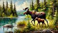 Majestic Moose and Calf in a Vibrant Canadian Landscape