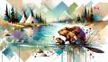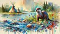 "Fiery Watercolors: An Artistic Beaver Overlooking a Canine River Scene"