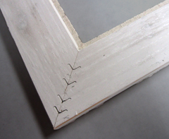 When an order is placed for a custom linen liner, the framer will cut the liner using the same saw or blade used for cutting picture frame mouldings. Also like a picture frame, the lengths are cut on a 45° angle, called a mitered edge. The lengths are joined using an underpinner, which shoots 90° nails - called wedges - into two, joined 40° corners to create a right angle.