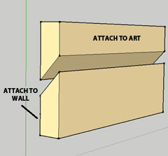 French Cleats are a hanging system in which mouldings are cut at a 45 degree angle and are secured by sliding the piece onto the other cleat. One cleat is attached to the wall and the other piece is attached to the artwork. As sawtooth hooks are recommended for small paintings (12x8"), French cleats are ideal for ACM panel paintings that are larger (8x10" and larger) as they provide much more rigid support for heavier ACM panels. French cleats come in wood or metal moldings.